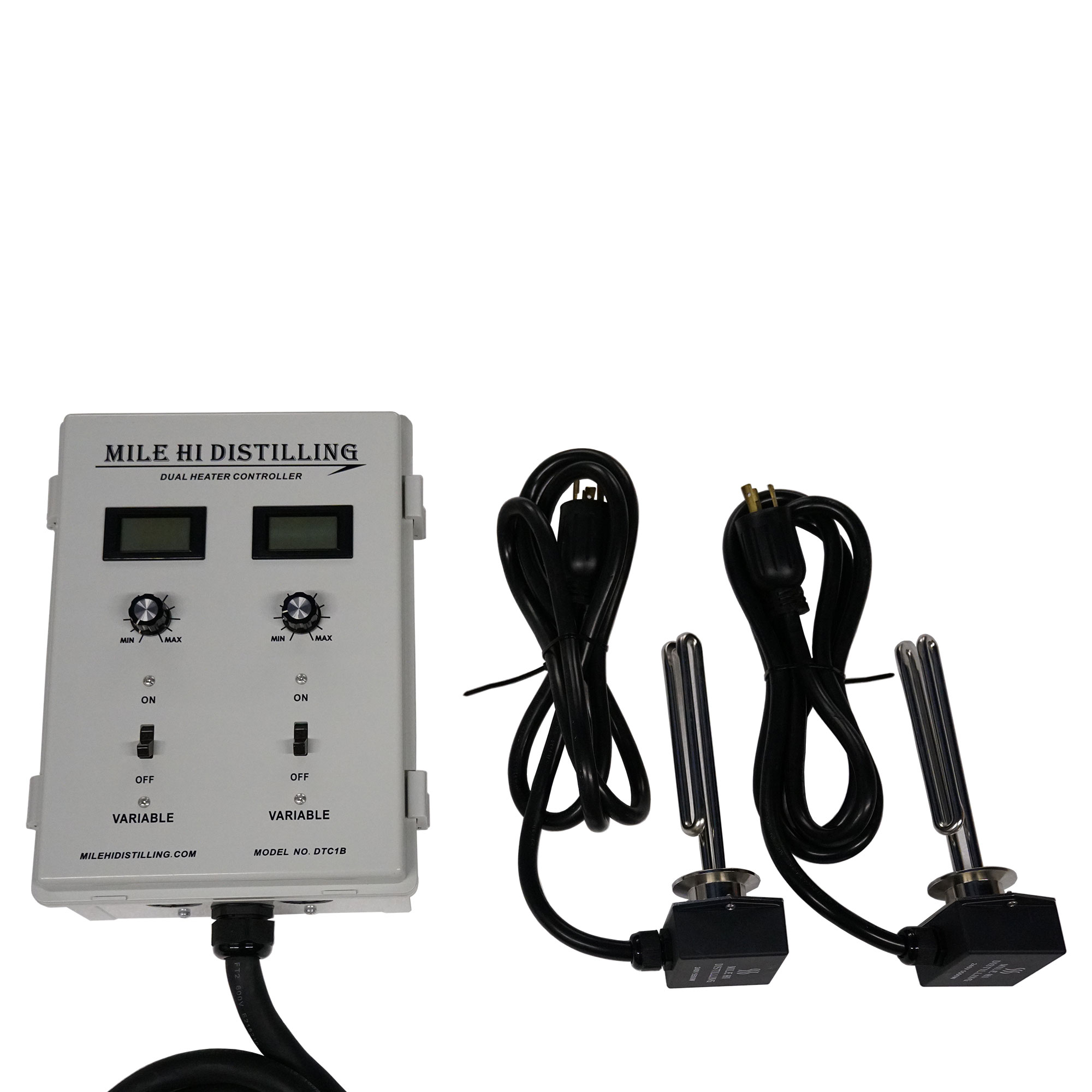 220V Dual Variable Element Temperature Controller. Both elements run on adjustable relays . This allows distillers to have total control of heat in their boiler. Here is a great heating system for boilers of 50 Gallons or more or can be used in smaller boilers to increase initial heat up time. This system is built to last and is ready to be hard wired in conduit or you can install a male plug to your matching receptacle configuration. This controller includes Two cable heater assemblies which each of them are 8ft wire lead to heating element, element housing with 2″ ferrule, and 5500 Watt Heating element. see photos