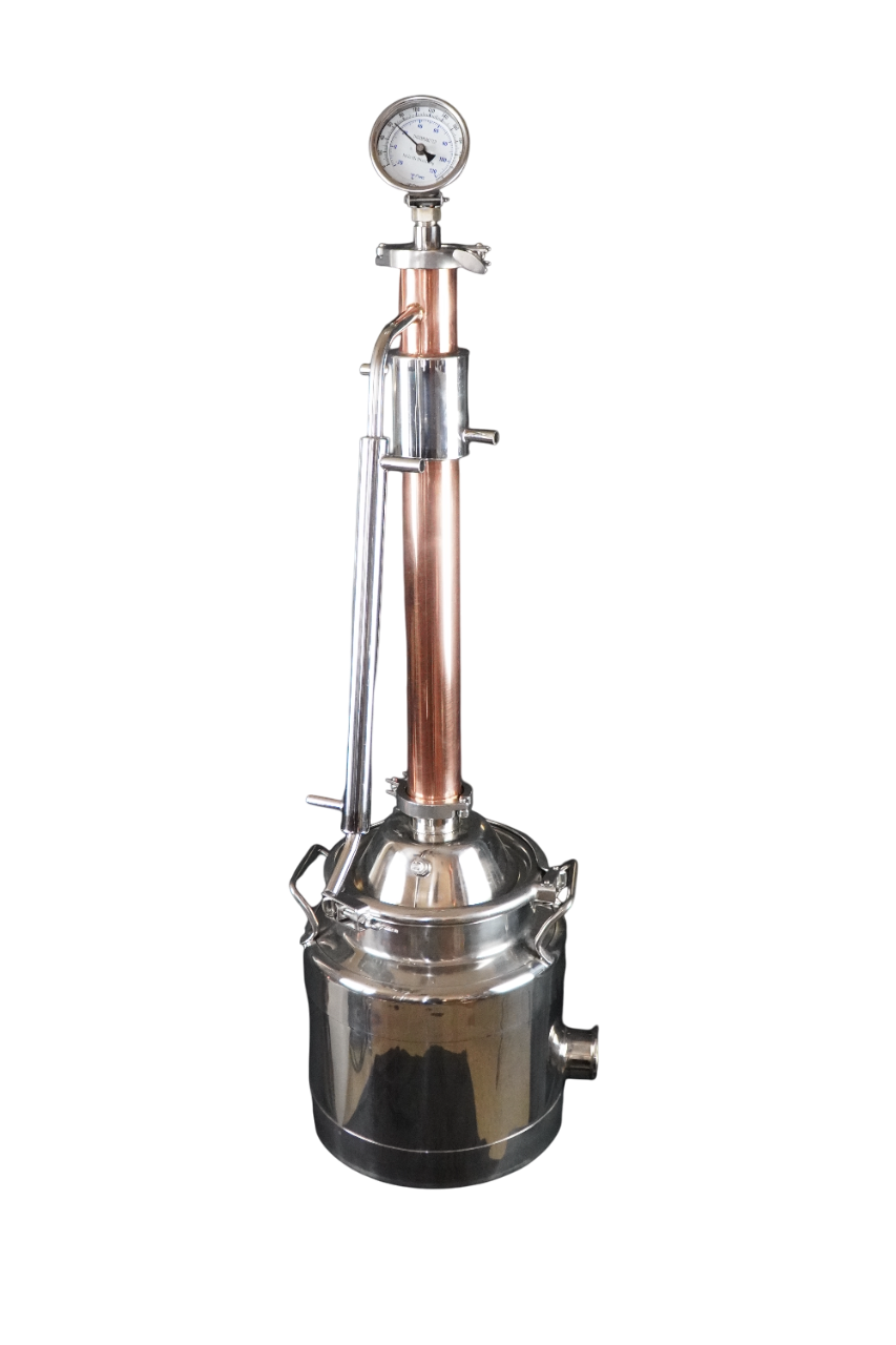 The stock tower comes with a digital thermometer, 2″ rubber bung, one 2″ clamp, and two 2″ gaskets. The Stainless Steel upgrade for $69.99 adds a 2.5″ dial thermometer as a replacement for the digital thermometer, and an NPT fitting to tighten the dial thermometer down in place of the bung, as well as an extra clamp and gasket to hold the NPT down. A free bag of yeast is sent with every still to get you started right away!