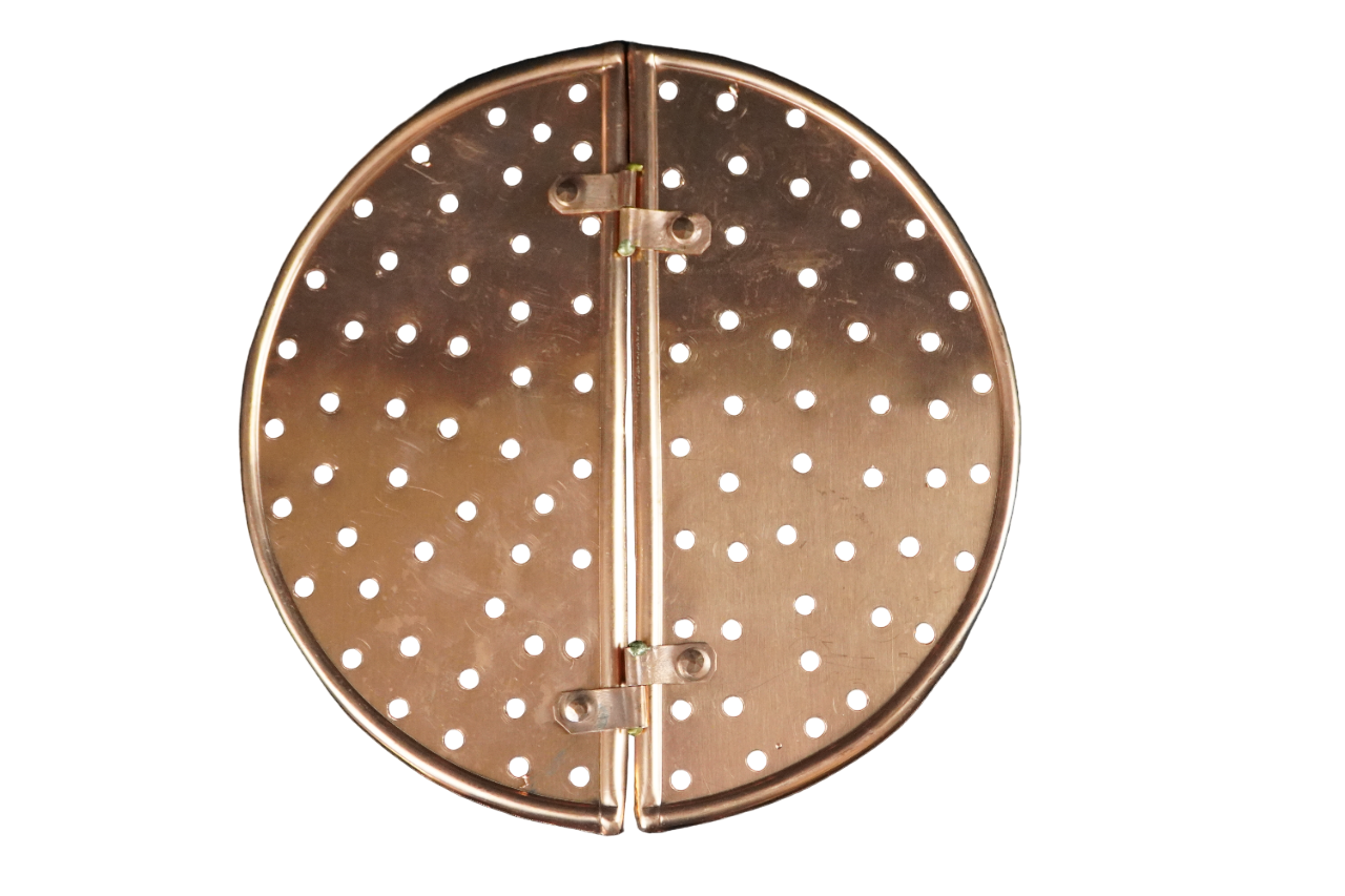 Copper sieve tray for 20L alembic still will prevent solid grains or fruits from touching the bottom of the Alembic still, allowing you to distill with the solids.