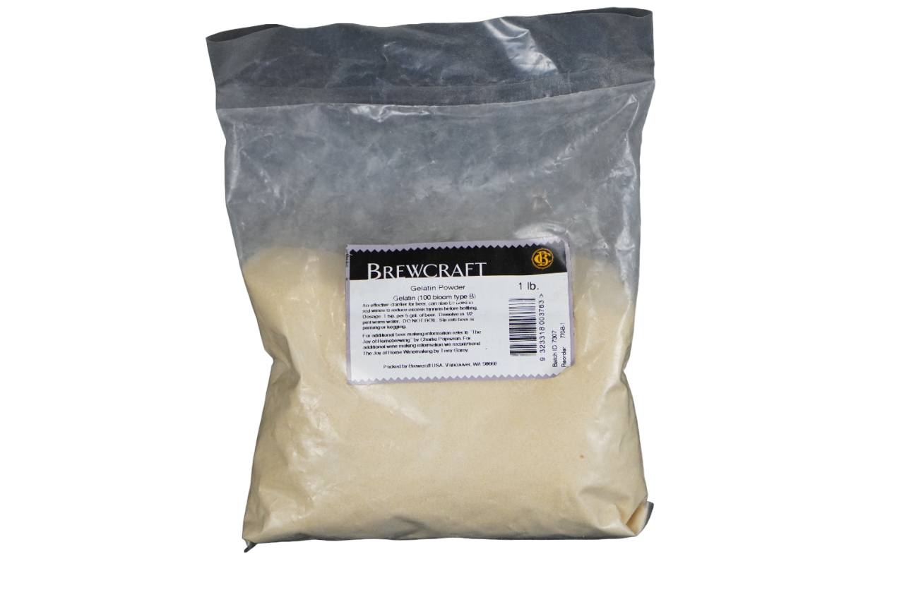 Gelatin powder is an effective clarifier for beer and can also be used in red wines to reduce excess tannins before bottling.